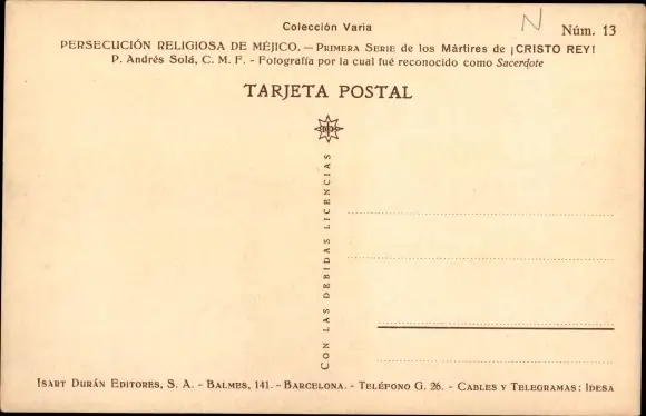 Ak P. Andres Sola, C. M. F. martirizado en S. Joaquin, Erstkommunion