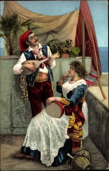 Ak Paar mit Musikinstrumenten in italienischen Trachten