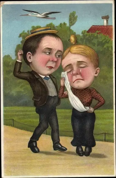 Ak Paar mit großen Köpfen, weinende Frau, Storch