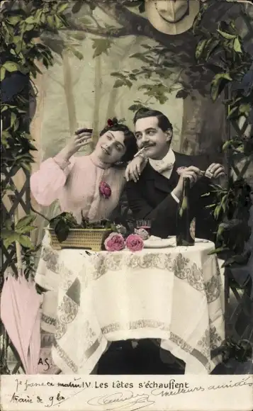 Ak Paar trinkt Wein in einem Garten, Mann mit Zigarette