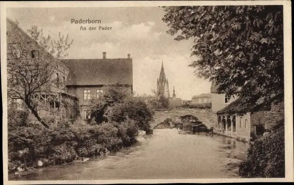Ak Paderborn in Westfalen, An der Pader, Brücke, Kirchturm
