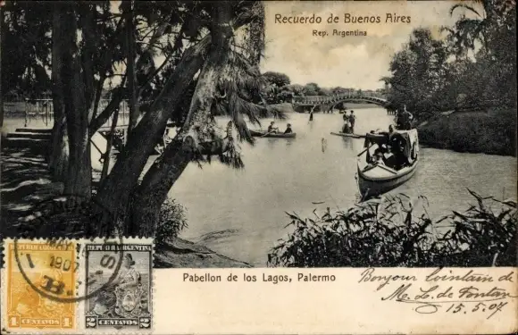 Ak Palermo Buenos Aires Argentinien, Pabellon de los Lagos, Bootpartie, Brücke