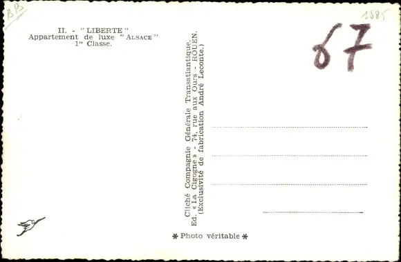 Ak Paquebot Liberté, CGT French Line, Appartement de luxe Alsace, 1re Classe