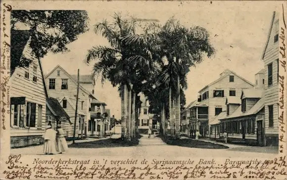 Ak Paramaribo Suriname, Noorderkerkstraat in 't verschiet de Surinaamsche Bank