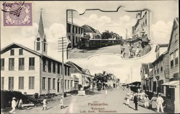 Ak Paramaribo Suriname, Waterkant, Luth. Kerk, Willemschool