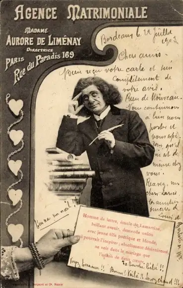 Ak Paris, Agence Matrimoniale, Madame Aurore de Limenay, Rue du Paradis 169