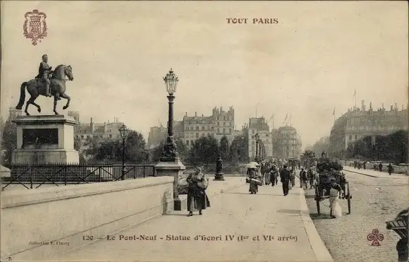 Ak Paris I Louvre, Le Pont Neuf, Statue d'Henri IV, Straßenpartie, Denkmal
