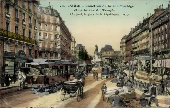 Ak Paris III, Rue de Turbigo, Rue du Temple, Straßenbahn