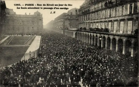 Ak Paris Louvre, La Rue de Rivoli, ein Feiertag