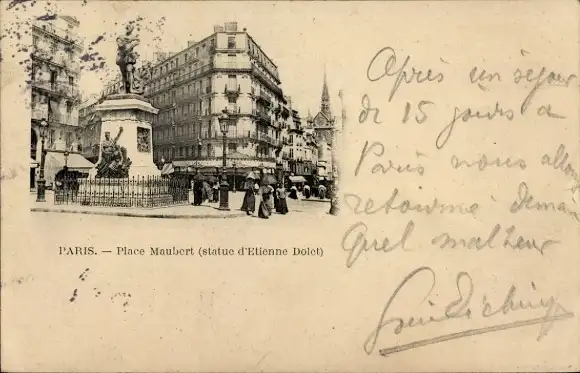 Ak Paris V, Place Maubert, Statue d'Etienne Dolet