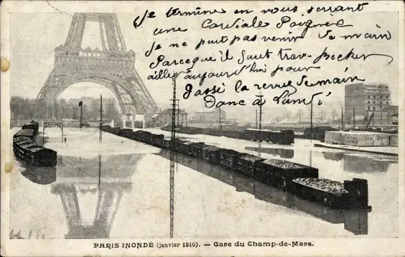Ak Paris VII, Bahnhof Champ de Mars, Eiffelturm, Hochwasser Januar 1910