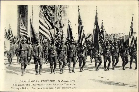 Ak Paris VIII, Triumphbogen, Arc de Triomphe, Defilé de la Victoire 1919, Drapeaux Americains