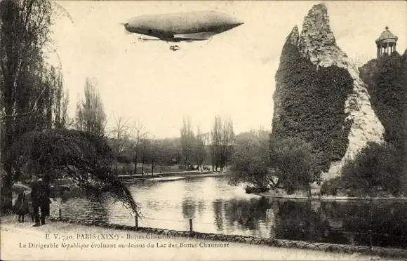 Ak Paris XIX Buttes Chaumont , Luftschiff über dem See, Buttes Chaumont, Parkszene, historisch...