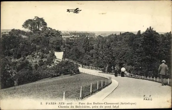 Ak Paris XIX Buttes Chaumont, Park, Chemin du Belvedere, pont fatal, Doppeldecker