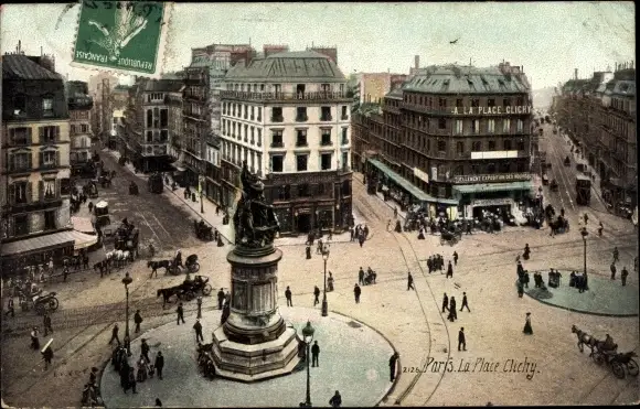 Ak Paris XVII., Place Clichy, Denkmal, Geschäfte