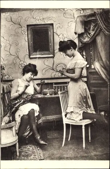 Ak Parisiennes fin de siecle, Frauen am Tisch, Wohnstube, Strümpfe