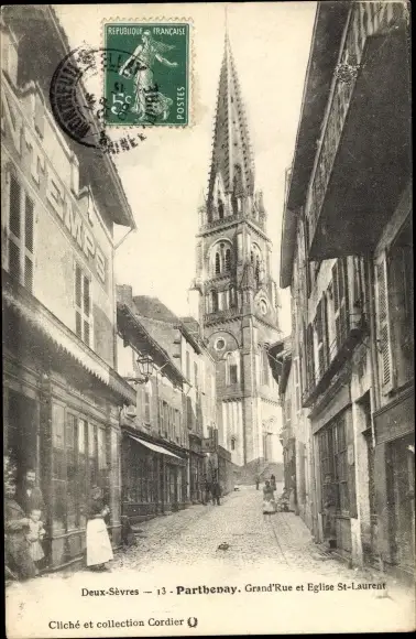 Ak Parthenay Deux Sevres, Grand'Rue, Eglise Saint Laurent
