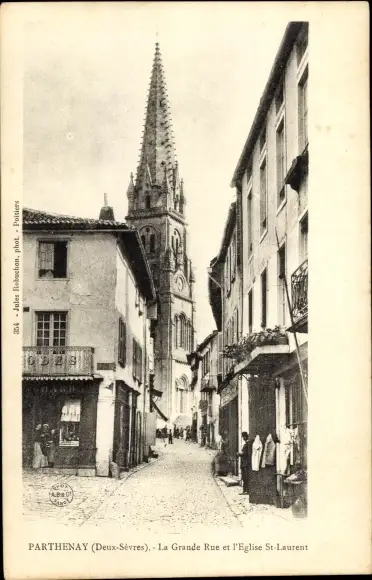 Ak Parthenay Deux Sèvres, La Grande Rue et l'Église Saint Laurent