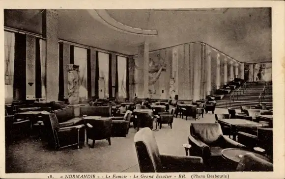 Ak Passagierschiff Normandie, CGT, Rauchsalon, Große Treppe