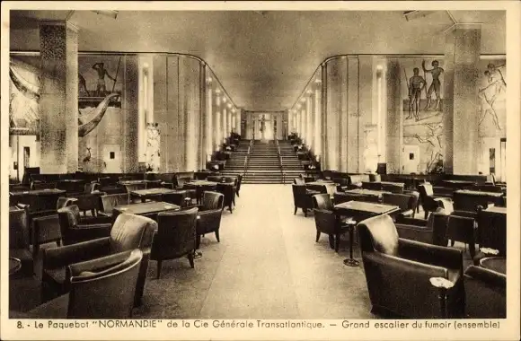 Ak Passagierschiff Normandie, CGT, Treppe des Rauchsalons