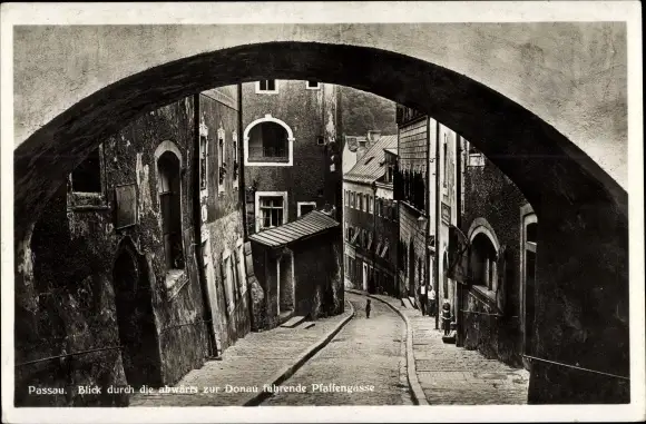 Ak Passau in Niederbayern, Blick durch die abwärts zur Donau führende Pfaffengasse