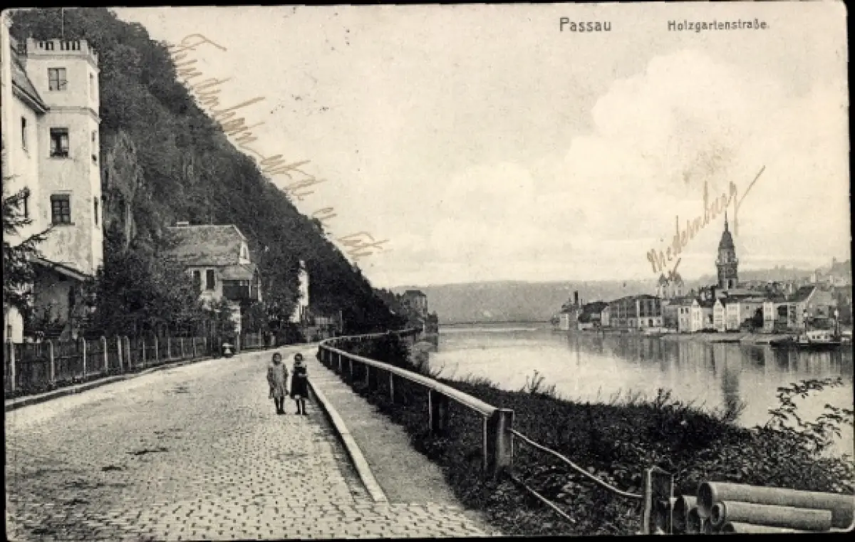 Ak Passau in Niederbayern, Holzgartenstraße, zwei Kinder, Fluss, Häuser