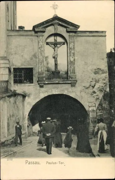 Ak Passau in Niederbayern, Paulustor, Kruzifix, Passanten