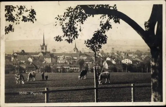 Ak Payerne Kt Waadt Schweiz, Ortsansicht, Kuhweide