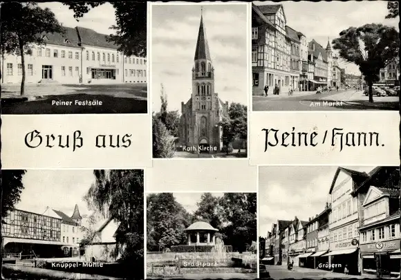 Ak Peine in Niedersachsen, Festsäle, katholische Kirche, Markt, Knüppel-Mühle, Stadtpark