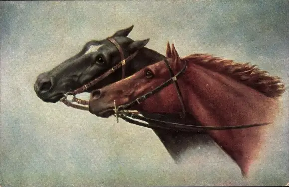 Ak Pferdegespann, Pferdeköpfe, Zaumzeug, Portrait