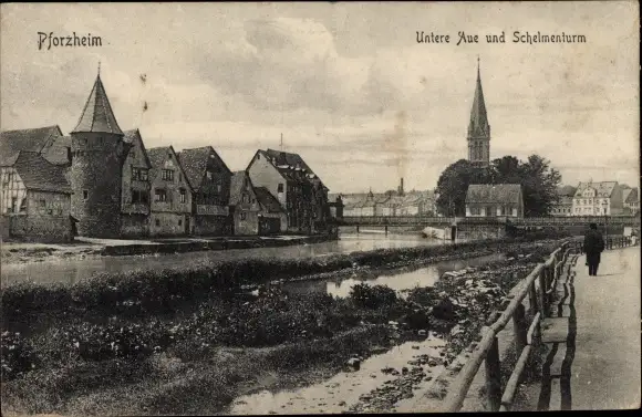 Ak Pforzheim im Schwarzwald, Untere Aue und Schelmenturm