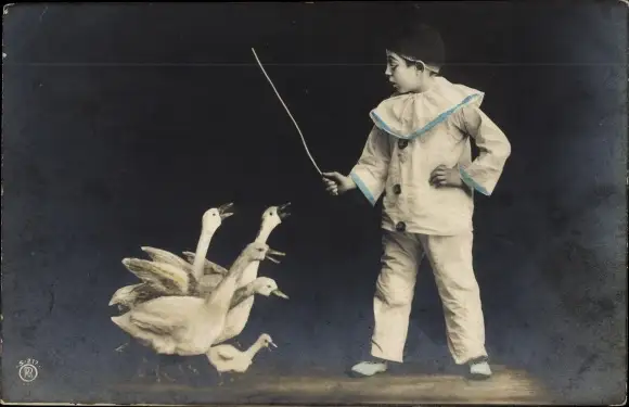 Ak Pierrot mit Gänsen, Gänsehirt