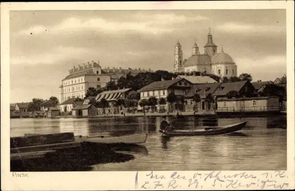 Ak Pinsk Weißrussland, Fluss, Ruderboot, Kirche