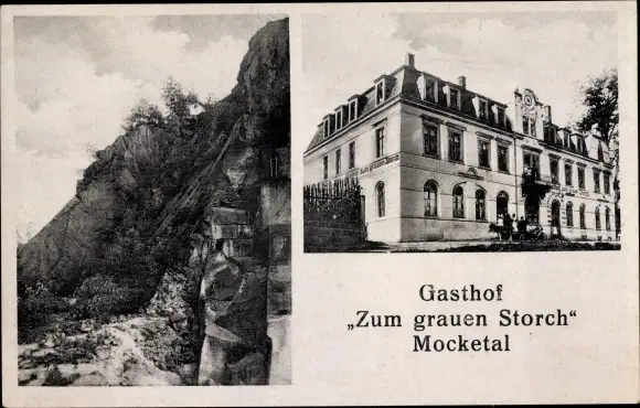 Ak Pirna in Sachsen, Gasthof Zum grauen Storch im Mocketal, Felspartie