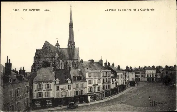 Ak Pithiviers Loiret, Place du Martroi et la Cathédrale