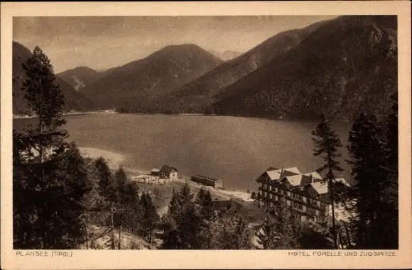 Ak Plansee in Tirol, Hotel Forelle und Zugspitze