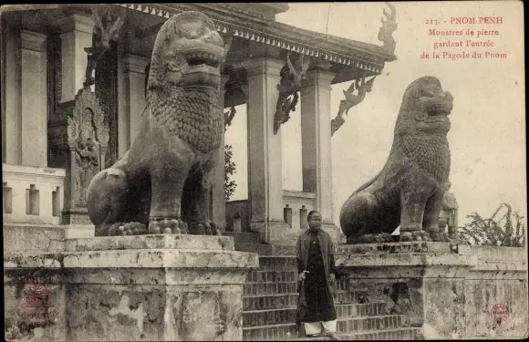 Ak Pnom Penh Kambodscha, Monstres de pierre gardant l'entrée de la Pagode du Pnom