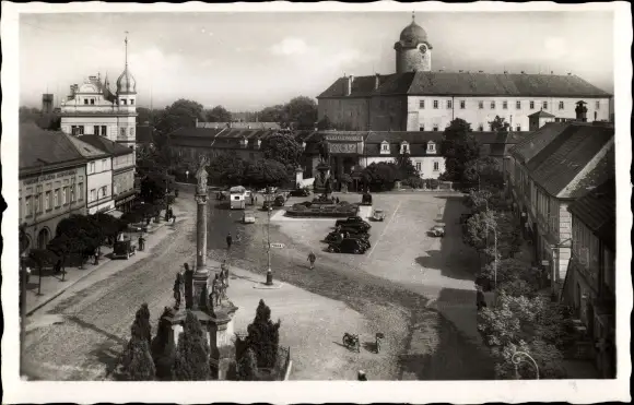 Ak Poděbrady Podiebrad Mittelböhmen, Vogelschau auf den Markt, Säule
