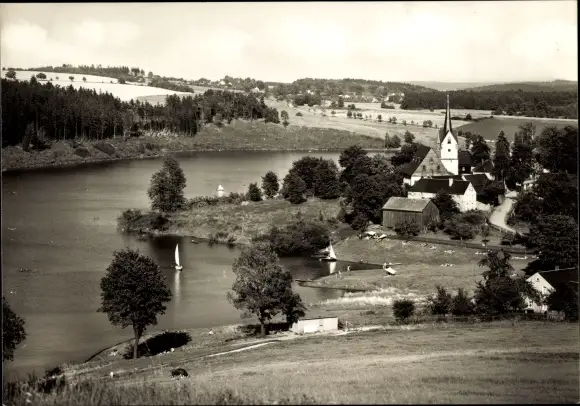 Ak Pöhl im Vogtland, Talsperre mit Altensalz, Kirche, Boote