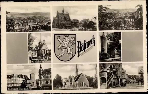 Ak Pößneck in Thüringen, Markt, Post und Kriegerdenkmal, Weißer Turm, Rathaustreppe, Wappen