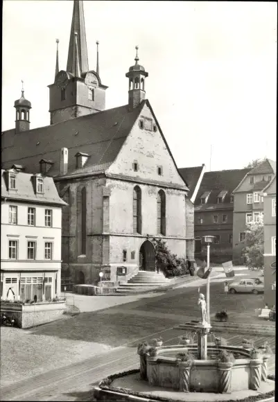 Ak Pößneck in Thüringen, Stadtkirche, Marktbrunnen