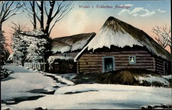 Ak Polen, Reetdachhaus im Winter