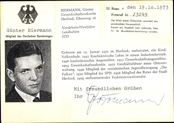 Ak Politiker Günter Biermann, Portrait, Autogramm
