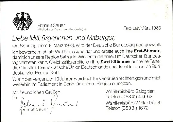 Ak Politiker Helmut Sauer, Portrait, Autogramm