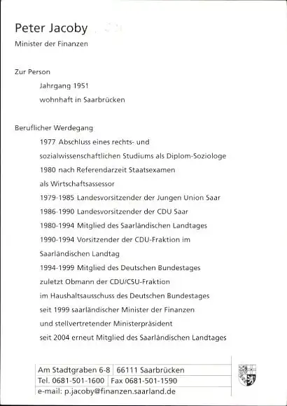 Ak Politiker Peter Jacoby, Finanzminister, Autogramm
