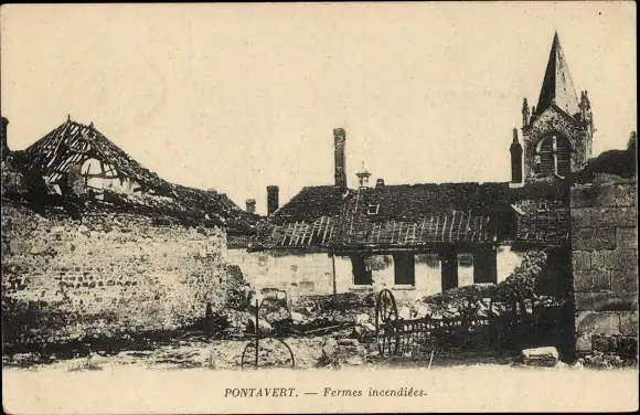 Ak Pontavert Aisne, Gefeuerte Bauernhöfe