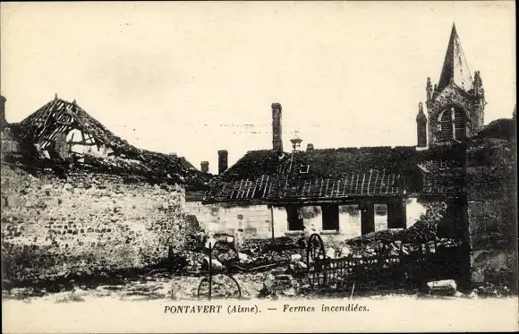 Ak Pontavert Aisne, fermes incediees, Kirche