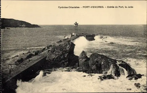 Ak Port Vendres Pyrénées Orientales, Entree du Port, la Jetee, Leuchtturm