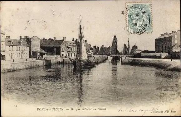 Ak Port en Bessin Calvados, Barque entrant au Bassin