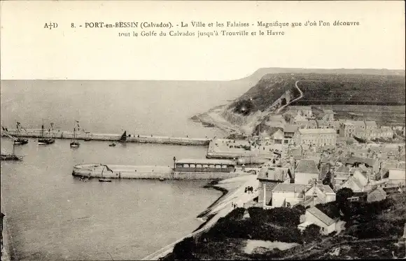 Ak Port en Bessin Calvados, La Ville, Les Falaises